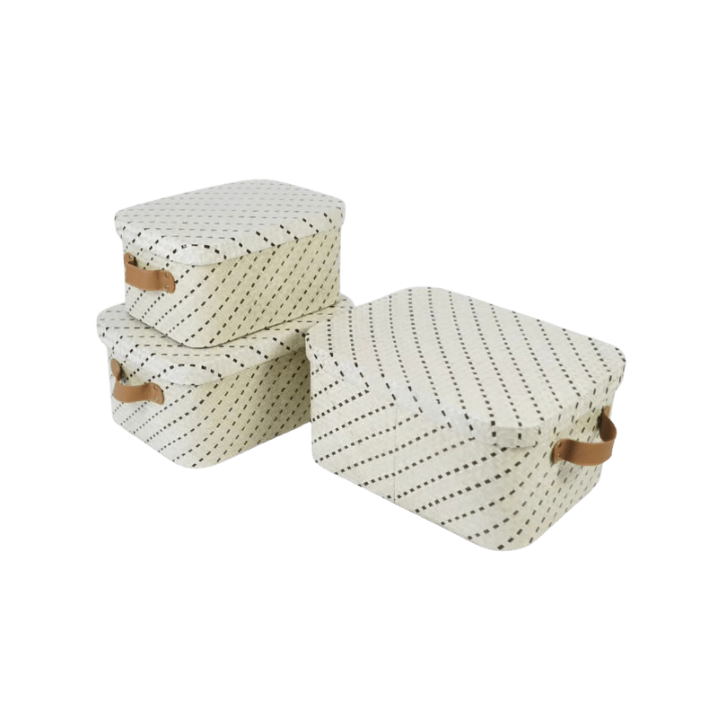 Set of three pandanus storage boxes in natural with subtle black stripes, each finished with