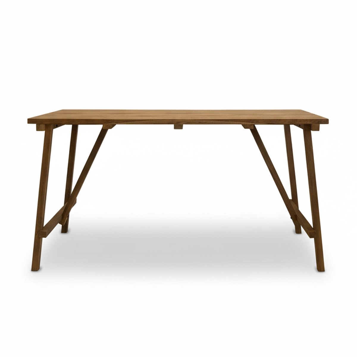 A rectangular wooden table with a slim top and angled trestle-style legs, offering a clean,