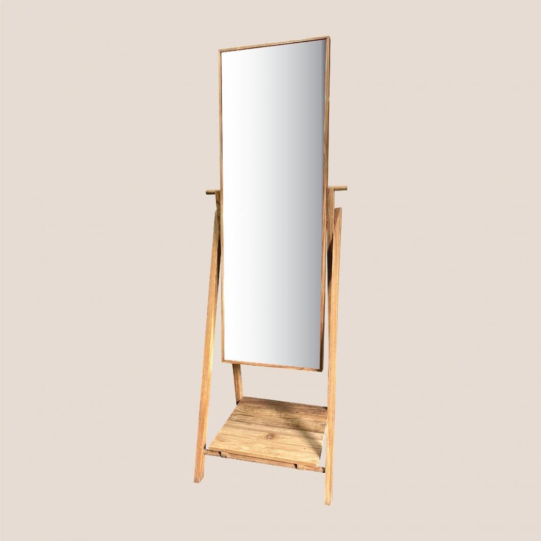 Freestanding full-length mirror with a minimalist wooden frame, angled stand, and convenient bottom shelf for
