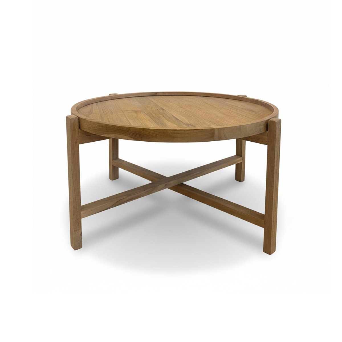 A round wooden table with a raised rim and clean cross-leg base, offering a warm natural look and sturdy everyday functionality.