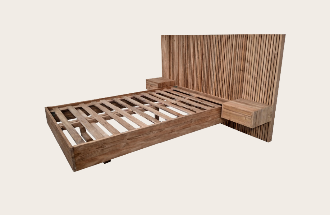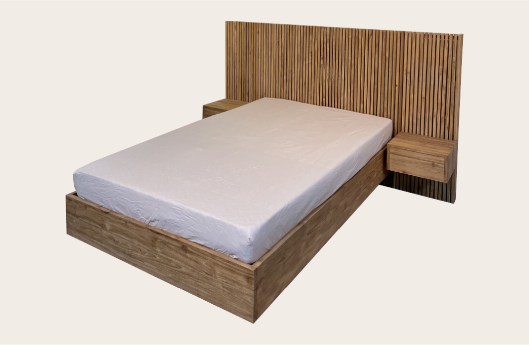 Modern wooden platform bed with a slatted base, full-height slatted headboard, and integrated floating nightstands—offering