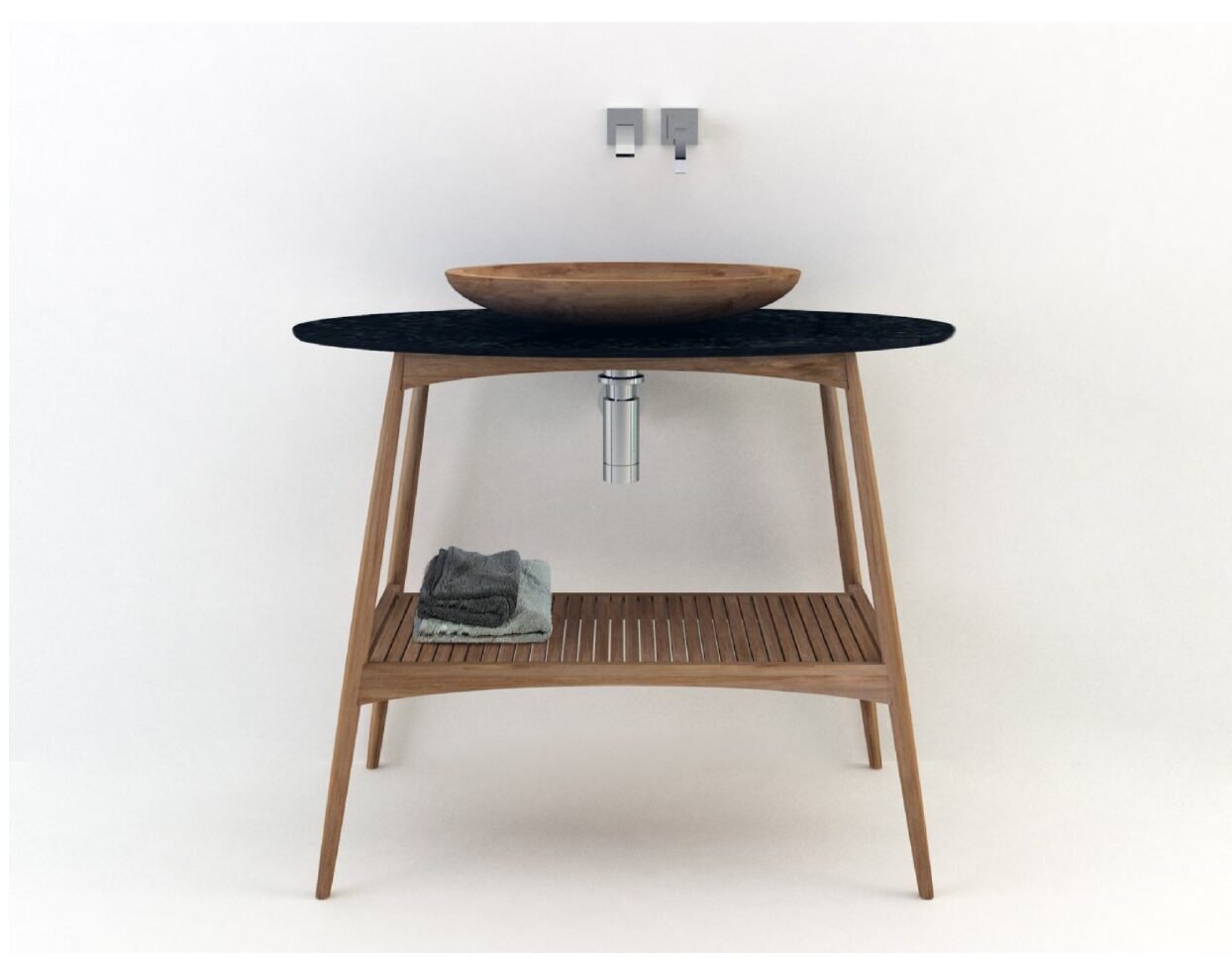 Sleek bathroom console with an oval countertop, solid wood frame, and slatted lower shelf for towels and accessories—combining warm natural timber with a minimal, contemporary silhouette.