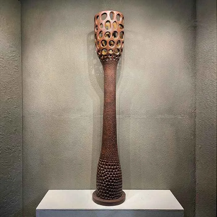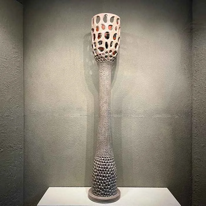 Sculptural standing lamp crafted from fiber cement, featuring a slender textured stem and perforated shade