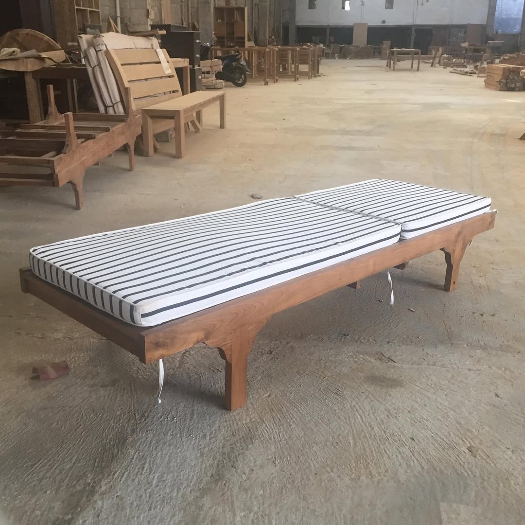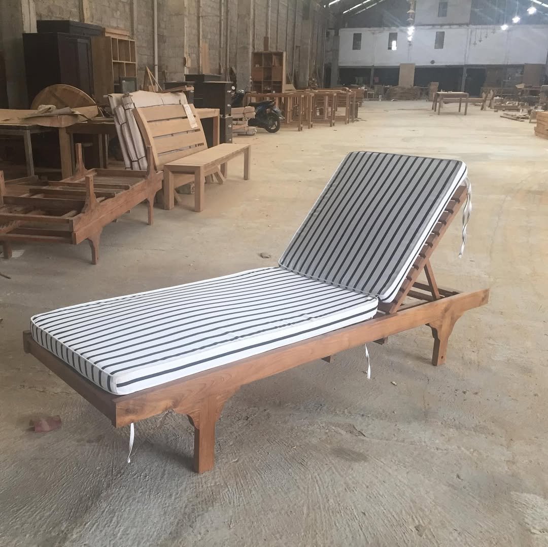 Teak wood adjustable sun lounger with a black-and-white striped outdoor cushion, perfect for relaxing by